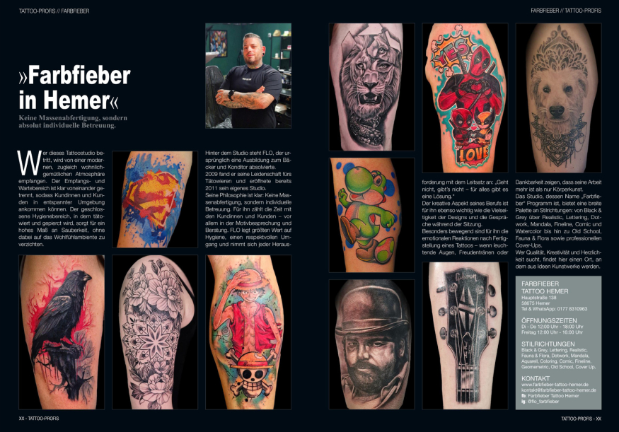 Flo hat über zehn Jahre Erfahrung und konnte schon viele Kunstwerke auf die Haut unserer Kunden verewigen. Werfen Sie gerne einen Blick in unsere Galerie und sehen Sie, welche verschiedenen Stile von Old School über Comic bis hin zur Realistic Flo beherrscht.
