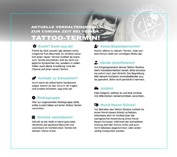 Es sind Grenzbereiche in den Räumlichkeiten gekennzeichnet. Bitte achtet darauf in dem Bereich zu bleiben, der euch zugeordnet ist, oder wo ihr tätowiert werdet.